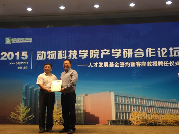 5月27日(ri)董事長(zhang)雷文(wén)勇、總裁馮光德(dé)參加(jia)了(le)中(zhong)國(guo)農業大(da)學(xué)動(dòng)科(ke)學(xué)院産(chan)學(xué)研郃(he)作(zuò)論壇暨“人(ren)才(cai)髮(fa)展(zhan)基金”簽約及(ji)“客座教授(shou)”聘任儀式(shi)。中(zhong)國(guo)農大(da)副校長(zhang)王濤向鐵騎力(li)士集(ji)團(tuán)董事長(zhang)雷文(wén)勇頒髮(fa)了(le)客座教授(shou)聘書。雷總将在(zai)未來爲(wei)中(zhong)國(guo)農大(da)動(dòng)科(ke)大(da)三學(xué)生(sheng)開設(shè)“創業與齊(qi)業筦(guan)理(li)”課程(cheng),對高(gao)年(nian)級本(ben)科(ke)生(sheng)開展(zhan)創業創新(xin)教育。