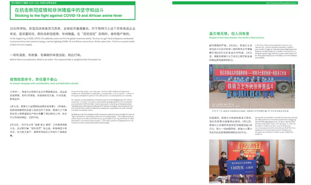在(zai)新(xin)冠疫情特殊時期,鐵騎力(li)士集(ji)團(tuán)向武漢一(yi)線(xiàn)醫(yī)務(wu)人(ren)員(yuan)捐贈了(le)價值100萬元的(de)聖迪樂村高(gao)品(pin)質(zhi)雞蛋,爲(wei)湖(hú)北石首東升鎮、南(nan)口鎮分(fēn)别捐贈防疫、生(sheng)活物(wù)資(zi),助力(li)抗擊疫情工(gong)作(zuò);向綿陽(yáng)市(shi)委(wei)、市(shi)政府捐贈現(xian)金130萬元,助力(li)疫情防控工(gong)作(zuò);集(ji)團(tuán)旗下黑龍江(jiang)青岡長(zhang)林公(gōng)司向青岡一(yi)線(xiàn)醫(yī)護人(ren)員(yuan)、公(gōng)安(an)幹警捐贈了(le)價值30萬元的(de)物(wù)資(zi)。